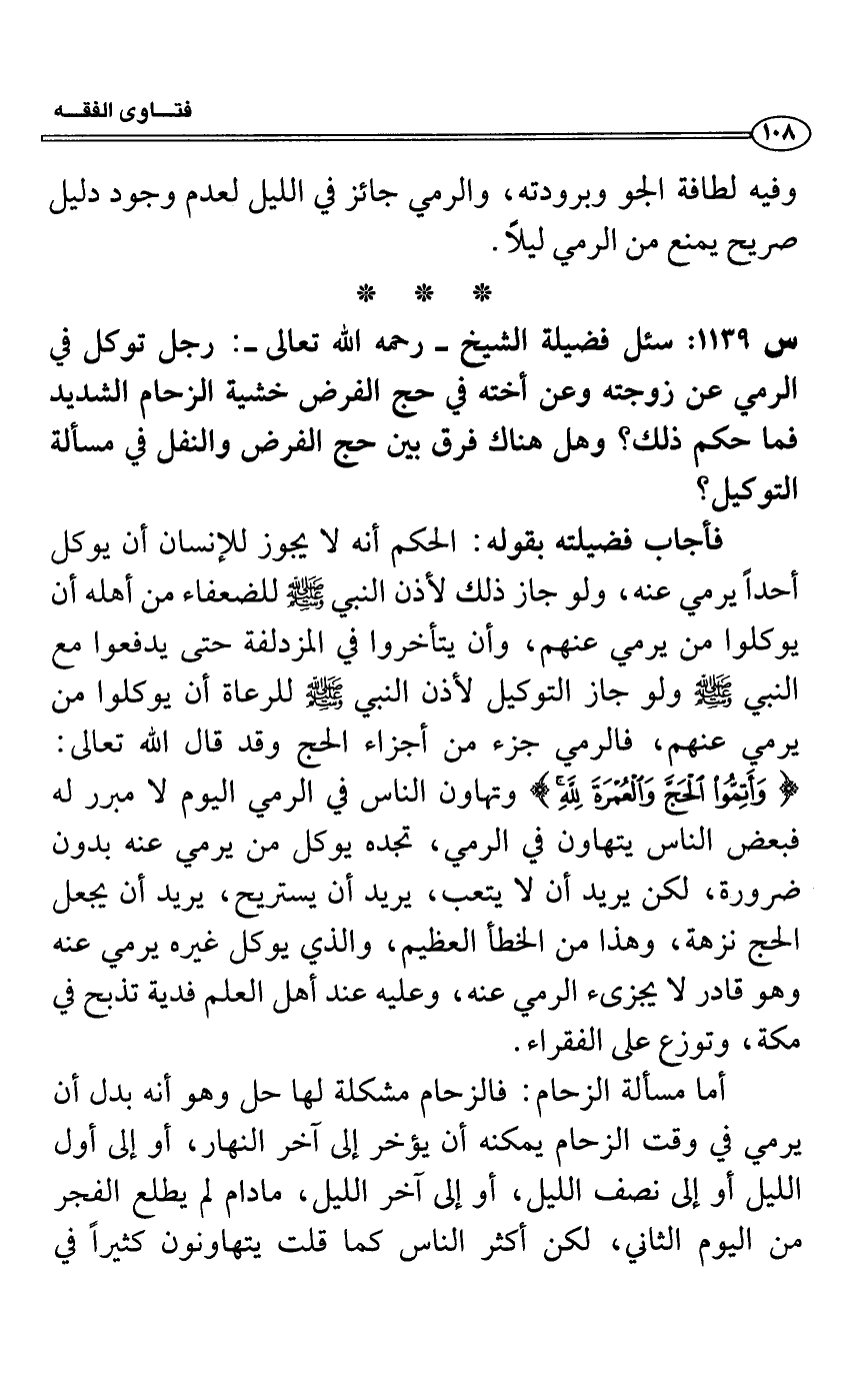 (وَأَتِمُّوا الْحَجَّ وَالْعُمْرَةَ للهِ) . وتهاون الناس في الرمي اليوم لا مبرر له فبعض الناس يتهاون في الرمي، تجده يوكل من يرمي عنه بدون ضرورة، لكن يريد أن لا يتعب، يريد أن يستريح، يريد أن يجعل