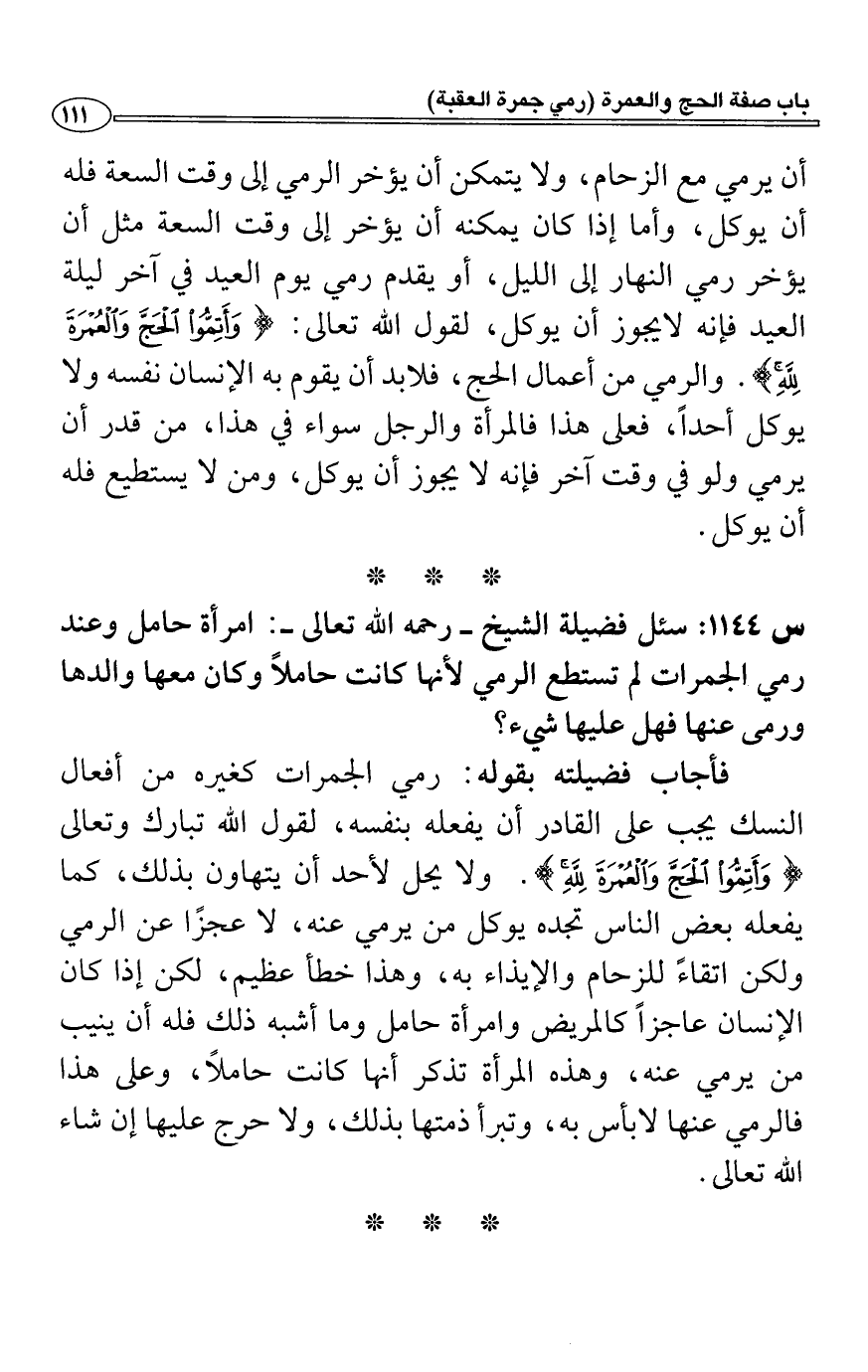 فأجاب فضيلته بقوله: رمي الجمرات كغيره من أفعال النسك يجب على القادر أن يفعله بنفسه، لقول الله تبارك وتعالى (وَأَتِمُّوا الْحَجَّ وَالْعُمْرَةَ للهِ) . ولا يحل لأحد أن يتهاون بذلك، كما يفعله بعض الناس تجده يوكل من يرمي عنه، لا عجزًا عن الرمي ولكن اتقاءً للزحام والإيذاء به، وهذا خطأ عظيم، لكن إذا كان الإنسان عاجزاً كالمريض وامرأة حامل وما أشبه ذلك فله أن ينيب من يرمي عنه، وهذه المرأة تذكر أنها كانت حاملاً، وعلى هذا فالرمي عنها لا بأس به، وتبرأ ذمتها بذلك، ولا حرج عليها إن شاء الله تعالى.