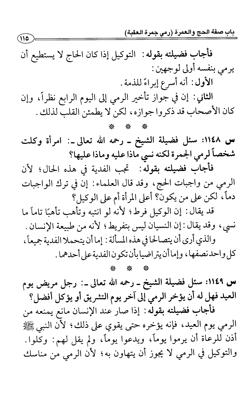 س1149: سئل فضيلة الشيخ- رحمه الله تعالى-: رجل مريض يوم العيد فهل له أن يؤخر الرمي إلى آخر يوم التشريق أو يوكل أفضل؟