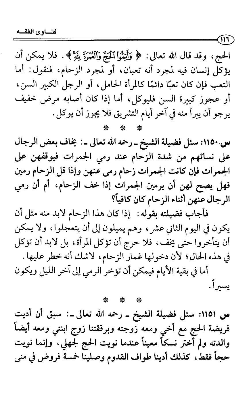 فأجاب فضيلته بقوله: إذا كان هذا الزحام لابد منه مثل أن يكون في اليوم الثاني عشر، وهم يميلون إلى أن يتعجلوا، ولا يمكن أن يتأخروا حتى يخف، فلا حرج أن تؤكل المرأة، بل لابد أن تؤكل