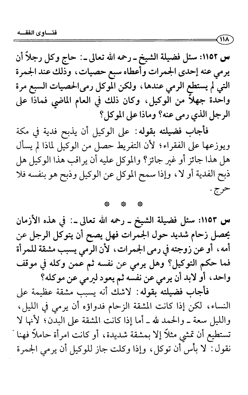 فأجاب فضيلته بقوله: على الوكيل أن يذبح فدية في مكة ويوزعها على الفقراء "لأن التفريط حصل من الوكيل لاذا لم يسأل هل هذا جائز أو غير جائز؟ والموكل عليه أن يراقب هذا الوكيل هل