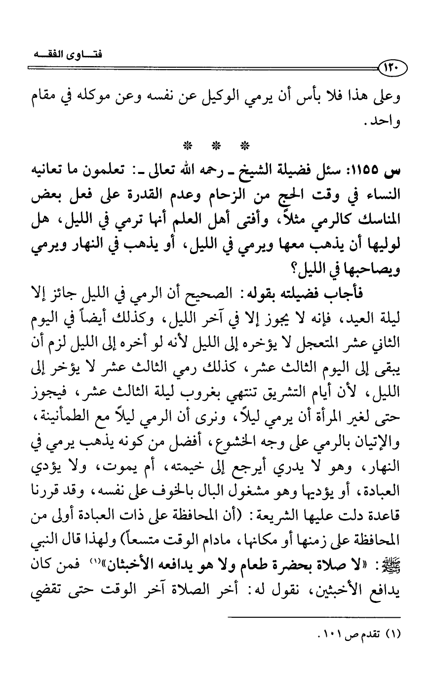 والإتيان بالرمي على وجه الخشوع، أفضل من كونه يذهب يرمي في النهار، وهو لا يدري أيرجع إلى خيمته، أم يموت، ولا يؤدي العبادة، أو يؤديها وهو مشغول البال بالخوف على نفسه، وقد قررنا قاعدة دلت عليها الشريعة: (أن المحافظة على ذات العبادة أولى من المحافظة على زمنها أو مكانها، مادام الوقت متسعاً) ولهذا قال النبي - صلى الله عليه وسلم -: (لا صلاة بحضرة طعام ولا هو يدافعه الأخبثان" (1) فمن كان يدافع الأخبثين، نقول له: أخر الصلاة آخر الوقت حتى تقضي