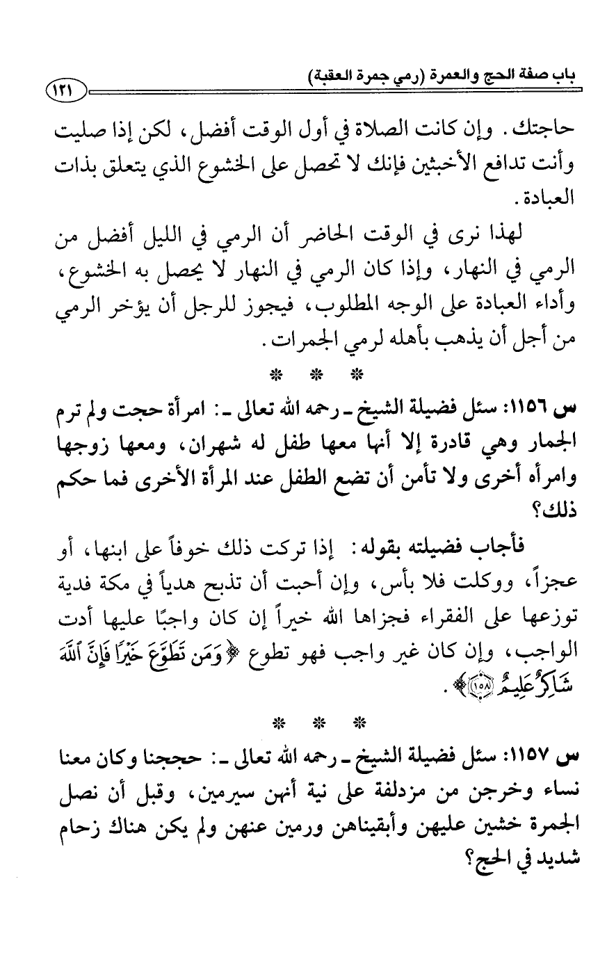 لهذا نرى في الوقت الحاضر أن الرمي في الليل أفضل من الرمي في النهار، وإذا كان الرمي في النهار لا يحصل به الخشوع، وأداء العبادة على الوجه المطلوب، فيجوز للرجل أن يؤخر الرمي