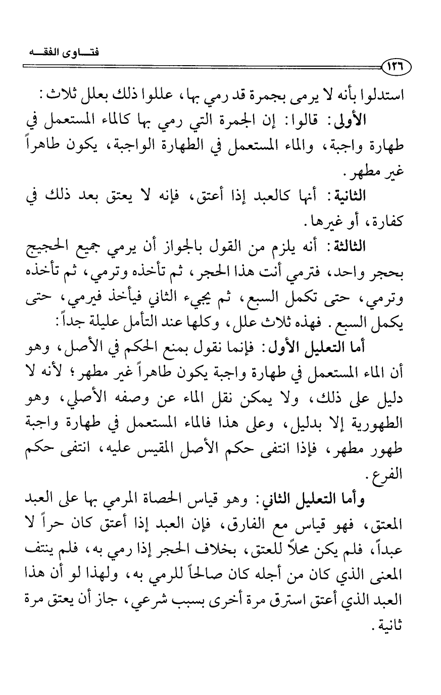 استدلوا بأنه لا يرمى بجمرة قد رمي بها، عللوا ذلك بعلل ثلاث: الأولى: قالوا: إن الجمرة التي رمي بها كالماء المستعمل في طهارة واجبة، والماء المستعمل في الطهارة الواجبة، يكون طاهراً غير مطهر.