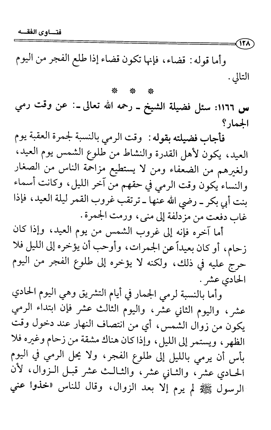 س1166: سئل فضيلة الشيخ- رحمه الله تعالى-: عن وقت رمي الجمار؟