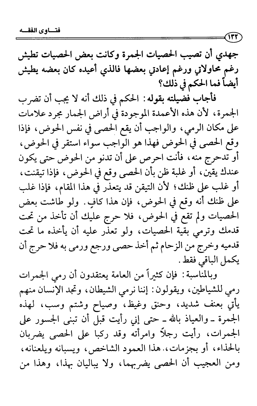 فأجاب فضيلته بقوله: الحكم في ذلك أنه لا يجب أن تضرب الجمرة، لأن هذه الأعمدة الموجودة في أراض الجمار مجرد علامات على مكان الرمي، والواجب أن يقع الحصى في نفس الحوض، فإذا
