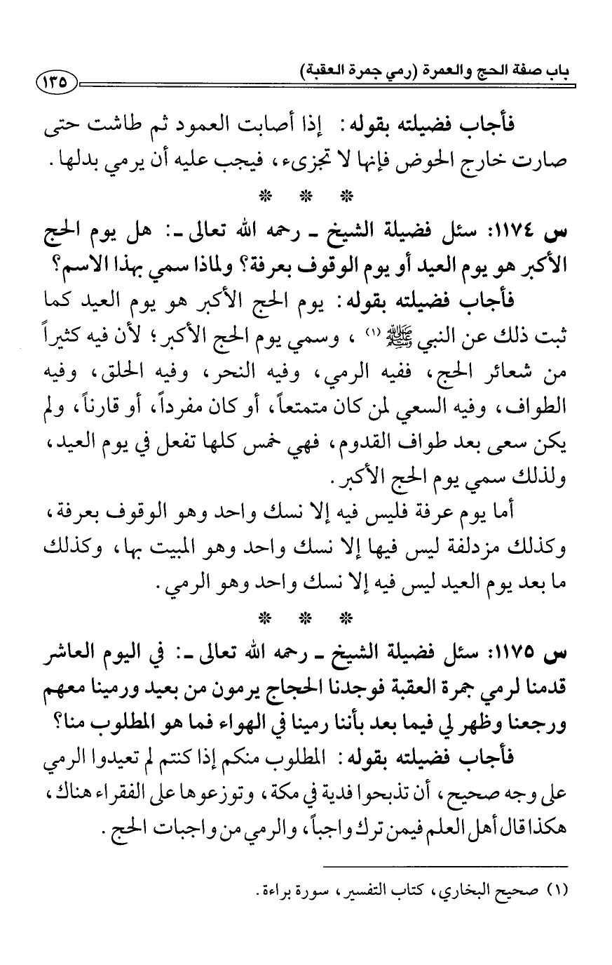 فأجاب فضيلته بقوله: يوم الحج الأكبر هو يوم العيد كما ثبت ذلك عن النبي - صلى الله عليه وسلم - (1) ، وسمي يوم الحج الأكبر؛ لأن فيه كثيراً من شعائر الحج، ففيه الرمي، وفيه النحر، وفيه الحلق، وفيه الطواف، وفيه السعي لمن كان متمتعاً، أو كان مفرداً، أو قارناً، ولم يكن سعى بعد طواف القدوم، فهي خمس كلها تفعل في يوم العيد، ولذلك سمي يوم الحج الأكبر.