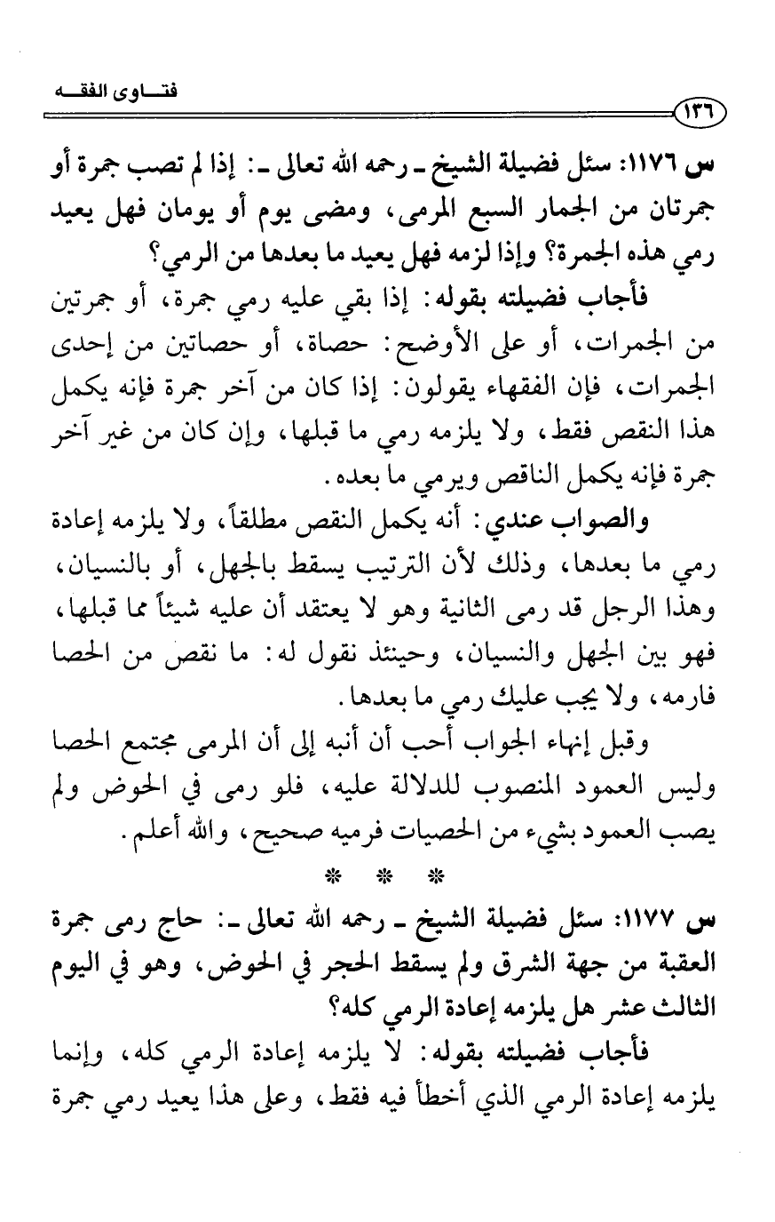 فأجاب فضيلته بقوله: إذا بقي عليه رمي جمرة، أو جمرتين من الجمرات، أو على الأوضح: حصاة، أو حصاتين من إحدى الجمرات، فإن الفقهاء يقولون: إذا كان من آخر جمرة فإنه يكمل هذا النقص فقط، ولا يلزمه رمي ما قبلها، وإن كان من غير آخر جمرة فإنه يكمل الناقص ويرمي ما بعده.