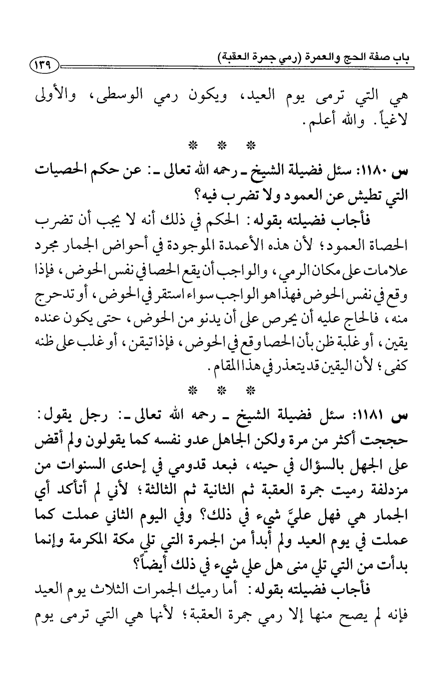 فأجاب فضيلته بقوله: الحكم في ذلك أنه لا يجب أن تضرب الحصاة العمود؛ لأن هذه الأعمدة الموجودة في أحواض الجمار لمجرد علامات على مكان الرمي، والواجب أن يقع الحصا في نفس الحوض، فإذا وقع في نفس الحوض فهذا هو الواجب سواء استقر في الحوض، أو تدحرج منه، فالحاج عليه أن يحرص على أن يدنو من الحوض، حتى يكون عنده يقين، أو غلبة ظن بأن الحصا وقع في الحوض، فإذا تيقن، أو غلب على ظنه كفى؛ لأن اليقين قد يتعذر في هذا المقام.