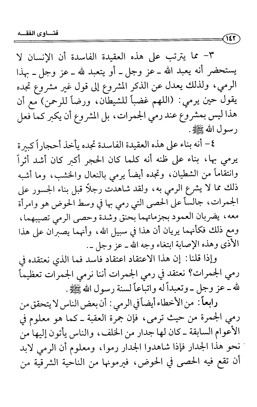 3- مما يترتب على هذه العقيدة الفاسدة أن الإنسان لا يستحضر أنه يعبد الله- عز وجل- أو يتعبد لله- عز وجل- بهذا الرمي، ولذلك يعدل عن الذكر المشروع إلى قول غير مشروع تجده يقول حين يرمي: (اللهم غضباً للشيطان، ورضاً للرحمن) مع أن هذا ليس بمشروع عند رمي الجمرات، بل المشروع أن يكبر كما فعل رسول الله - صلى الله عليه وسلم -.