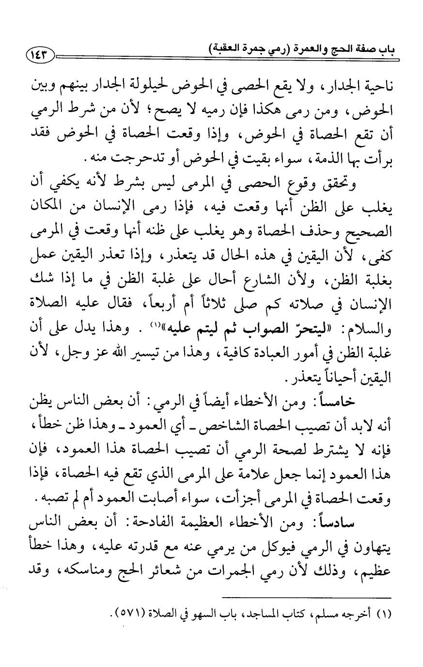 وتحقق وقوع الحصى في المرمى ليس بشرط لأنه يكفي أن يغلب على الظن أنها وقعت فيه، فإذا رمى الإنسان من المكان الصحيح وحذف الحصاة وهو يغلب على ظنه أنها وقعت في المرمى كفى، لأن اليقين في هذه الحال قد يتعذر، وإذا تعذر اليقين عمل بغلبة الظن، ولأن الشارع أحال على غلبة الظن في ما إذا شك الإنسان في صلاته كم صلى ثلاثاً أم أربعاً، فقال عليه الصلاة والسلام: "ليتحرّ الصواب ثم ليتم عليه" (1) . وهذا يدل على أن غلبة الظن في أمور العبادة كافية، وهذا من تيسير الله عز وجل، لأن اليقين أحياناً يتعذر.