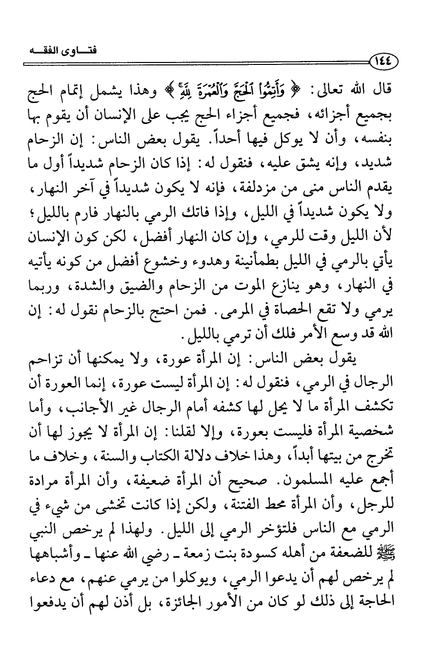 للرجل، وأن المرأة محط الفتنة، ولكن إذا كانت تخشى من شيء في الرمي مع الناس فلتؤخر الرمي إلى الليل. ولهذا لم يرخص النبي - صلى الله عليه وسلم - للضعفة من أهله كسودة بنت زمعة- رضي الله عنها- وأشباهها لم يرخص لهم أن يدعوا الرمي، ويوكلوا من يرمي عنهم، مع دعاء
