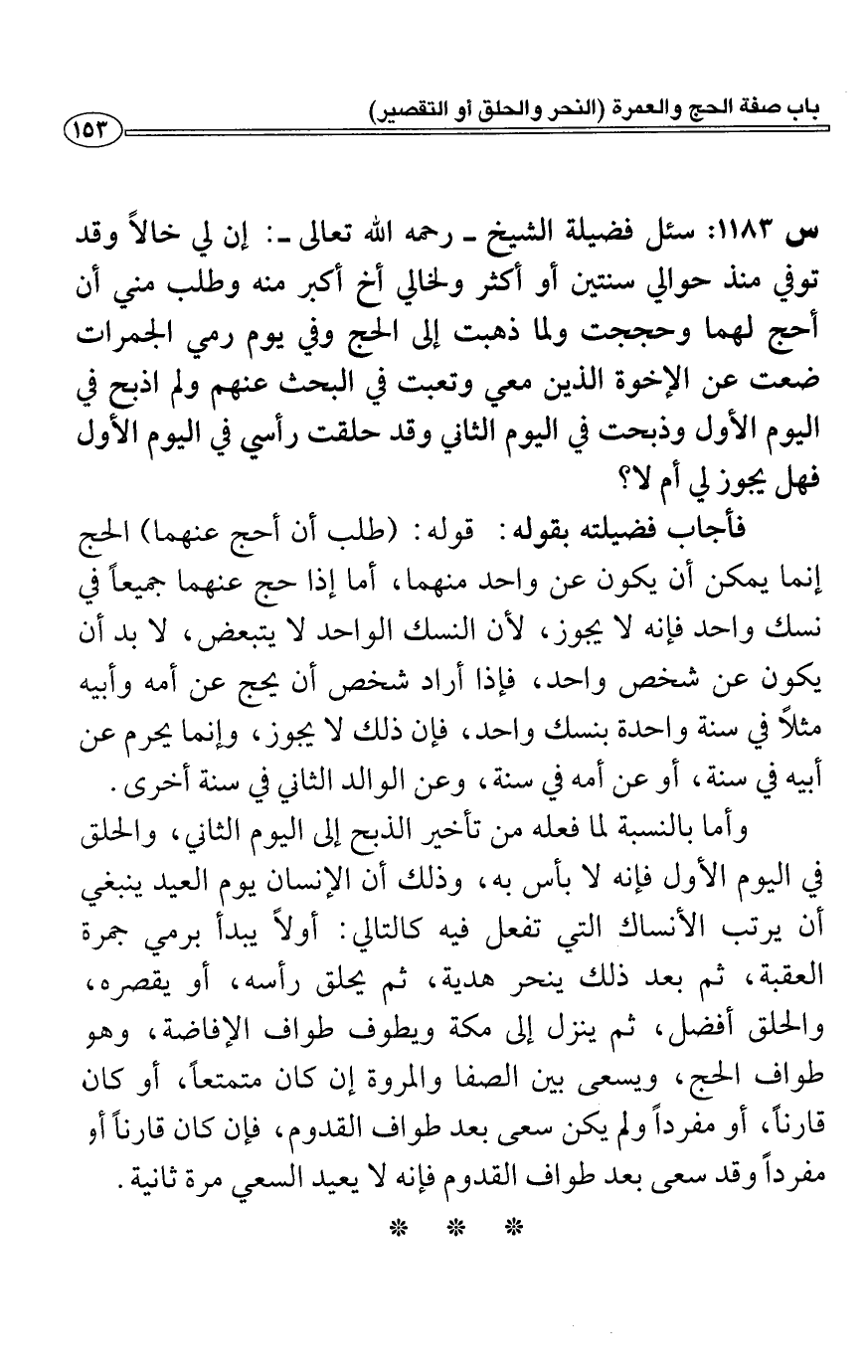 س1183: سئل فضيلة الشيخ- رحمه الله تعالى-: إن لي خالاً وقد توفي منذ حوالي سنتين أو أكثر ولخالي أخ أكبر منه وطلب مني أن أحج لهما وحججت ولما ذهبت إلى الحج وفي يوم رمي الجمرات