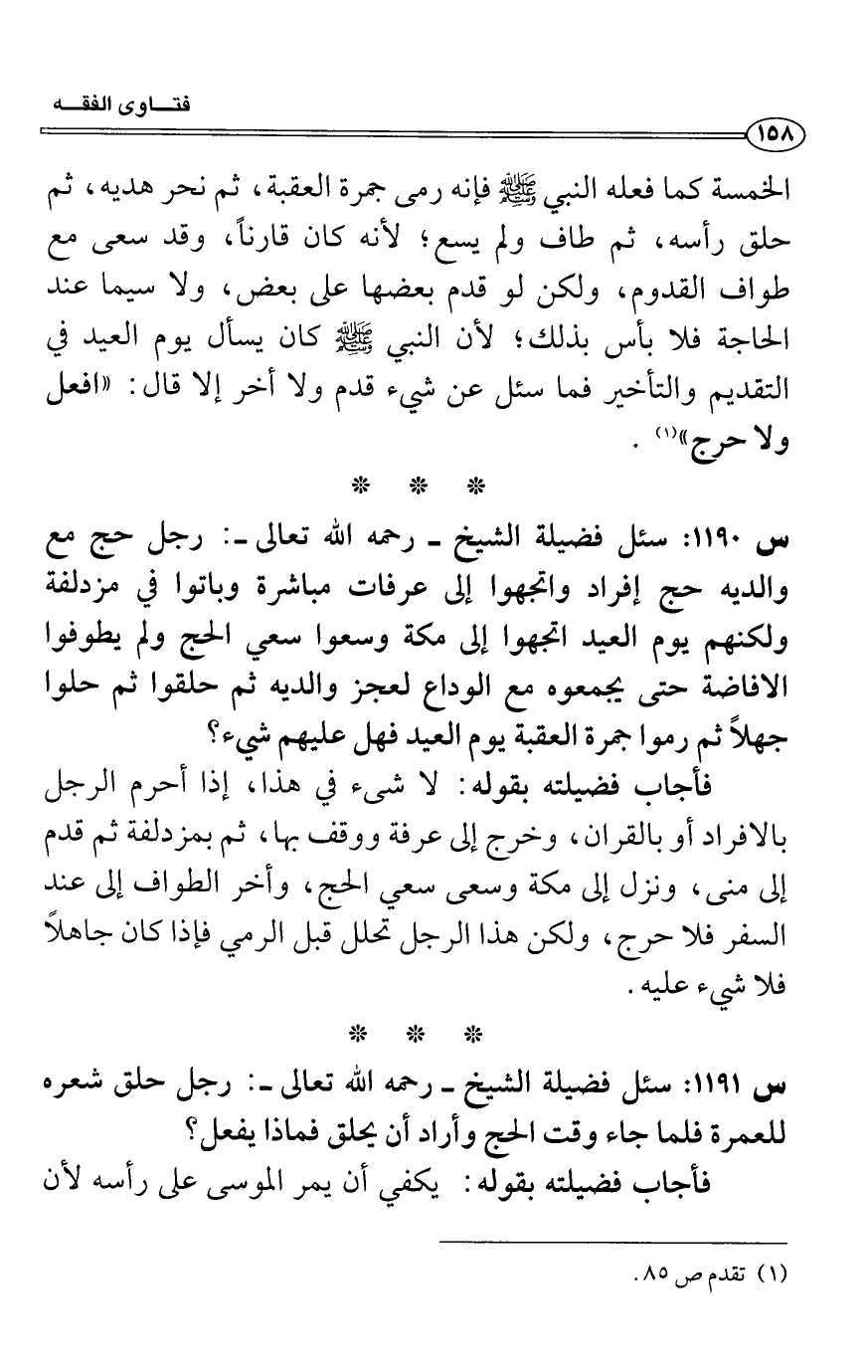 فأجاب فضيلته بقوله: لا شيء في هذا، إذا أحرم الرجل بالإفراد أو بالقران، وخرج إلى عرفة ووقف بها، ثم بمزدلفة ثم قدم إلى منى، ونزل إلى مكة وسعى سعي الحج، وأخر الطواف إلى عند السفر فلا حرج، ولكن هذا الرجل تحلل قبل الرمي فإذا كان جاهلاً فلا شيء عليه.