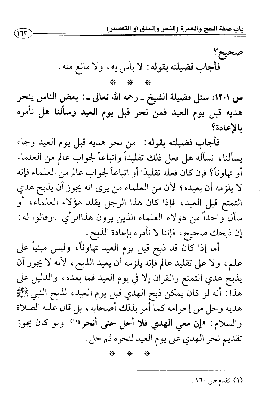 فأجاب فضيلته بقوله: من نحر هديه قبل يوم العيد وجاء يسألنا، نسأله هل فعل ذلك تقليداً وإتباعاً لجواب عالم من العلماء أو تهاوناً؟ فإن كان فعله تقليدًا أو إتباعاً لجواب عالم من العلماء فإنه لا يلزمه أن يعيده؛ لأن من العلماء من يرى أنه يجوز أن يذبح هدي التمتع قبل العيد، فإذا كان هذا الرجل يقلد هؤلاء العلماء، أو سأل واحل لأن من هؤلاء العلماء الذين يرون هذا الرأي. وقالوا له:
