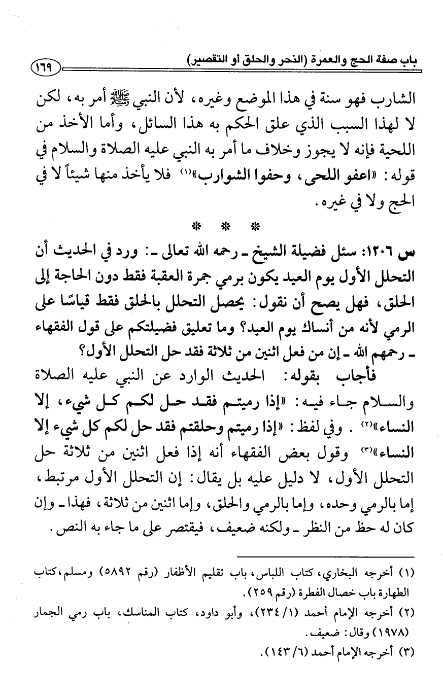 فأجاب بقوله: الحديث الوارد عن النبي عليه الصلاة والسلام جاء فيه: "إذا رميتم فقد حل لكم كل شيء، إلا النساء" (2) . وفي لفظ: "إذا رميتم وحلقتم فقد حل لكم كل شيء إلا النساء" (3) وقول بعض الفقهاء أنه إذا فعل اثنين من ثلاثة حل التحلل الأول، لا دليل عليه بل يقال: إن التحلل الأول مرتبط، إما بالرمي وحده، هاما بالرمي والحلق، وإما اثنين من ثلاثة، فهذا- وإن كان له حظ من النظر- ولكنه ضعيف، فيقتصر على ما جاء به النص.