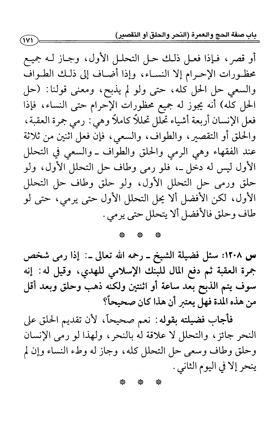 س1208: سئل فضيلة الشيخ- رحمه الله تعالى-: إذا رمى شخص جمرة العقبة ثم دفع المال للبنك الإسلامي للهدي، وقيل له: إنه سوف يتم الذبح بعد ساعة أو اثنتين ولكنه ذهب وحلق وبعد أقل