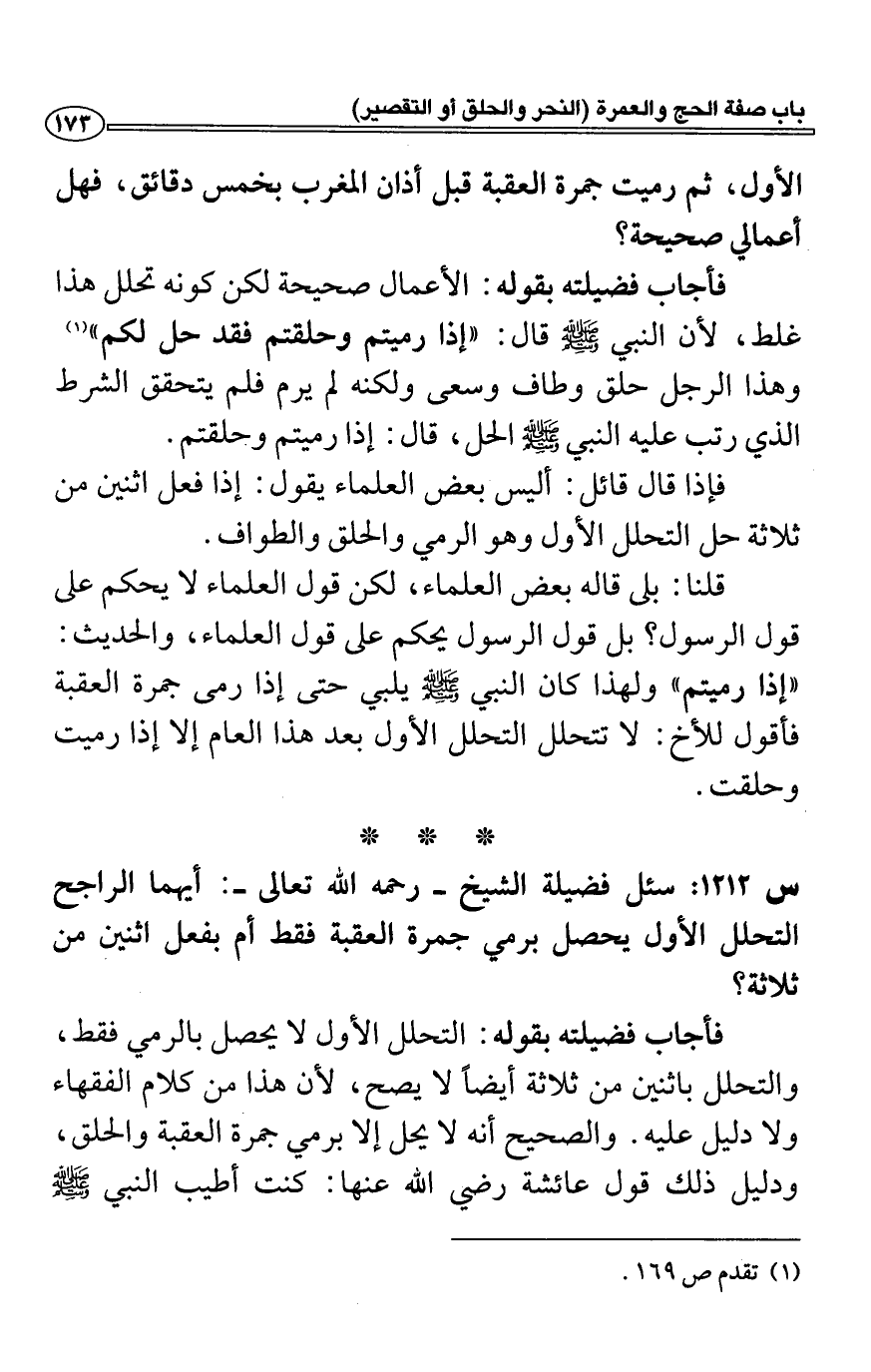 فأجاب فضيلته بقوله: التحلل الأول لا يحصل بالرمي فقط، والتحلل باثنين من ثلاثة أيضاً لا يصح، لأن هذا من كلام الفقهاء ولا دليل عليه. والصحيح أنه لا يحل إلا برمي جمرة العقبة والحلق،