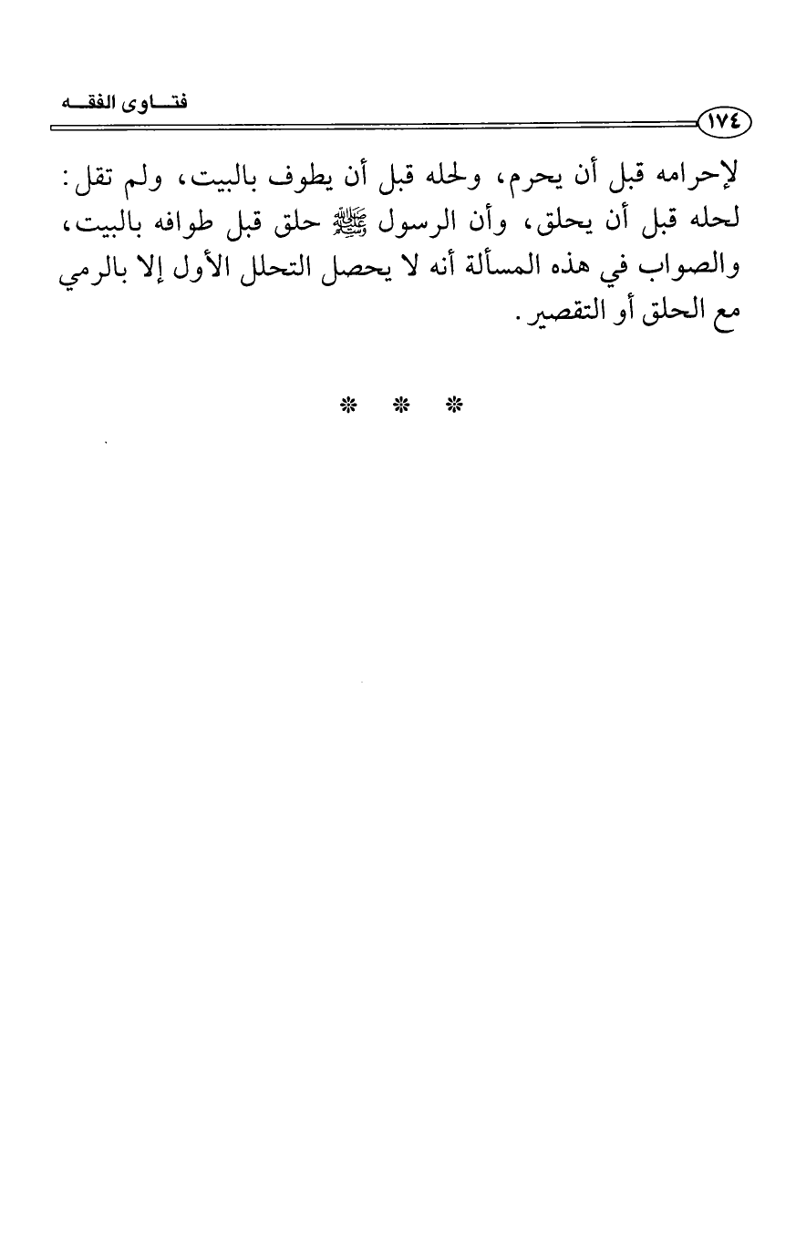 لإحرامه قبل أن يحرم، ولحله قبل أن يطوف بالبيت، ولم تقل: لحله قبل أن يحلق، وأن الرسول - صلى الله عليه وسلم - حلق قبل طوافه بالبيت، والصواب في هذه المسألة أنه لا يحصل التحلل الأول إلا بالرمي مع الحلق أو التقصير.