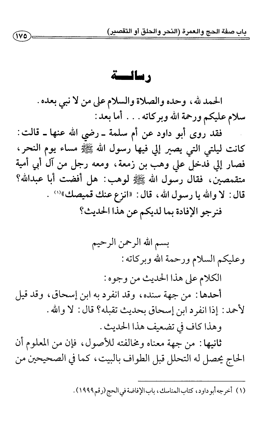 فقد روى أبو داود عن أم سلمة- رضي الله عنها- قالت: كانت ليلتي التي يصير إلي فيها رسول الله - صلى الله عليه وسلم - مساء يوم النحر، فصار إلي فدفي علي وهب بن زمعة، ومعه رجل من آل أبي أمية متقمصين، فقال رسول الله - صلى الله عليه وسلم - لوهب: هل أفضت أبا عبد الله؟