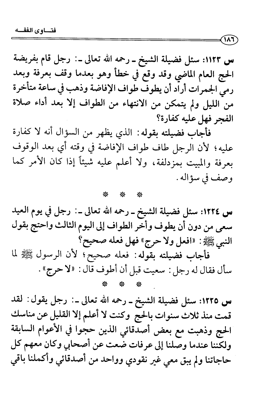 فأجاب فضيلته بقوله: الذي يظهر من السؤال أنه لا كفارة عليه؛ لأن الرجل طاف طواف الإفاضة في وقته أي بعد الوقوف بعرفة والمبيت بمزدلفة، ولا أعلم عليه شيئاً إذا كان الأمر كما