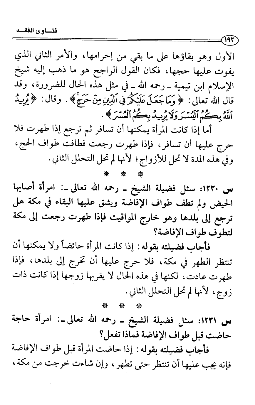 الأول وهو بقاؤها على ما بقي من إحرامها، والأمر الثاني الذي يفوت عليها حجها، فكان القول الراجح هو ما ذهب إليه شيخ الإسلام ابن تيمية- رحمه الله- في مثل هذه الحال للضرورة، وقد