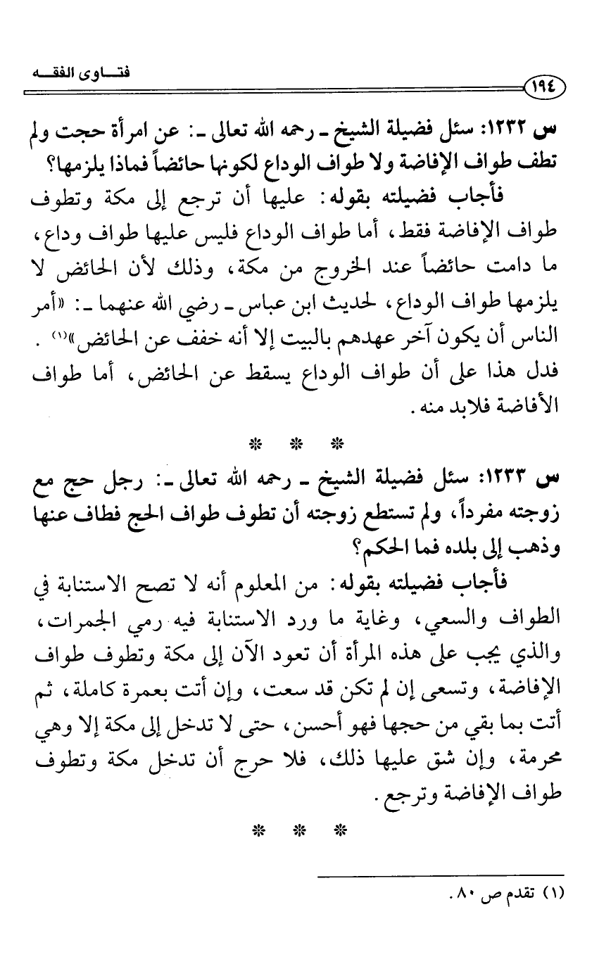 س1232: سئل فضيلة الشيخ- رحمه الله تعالى-: عن امرأة حجت ولم تطف طواف الإفاضة ولا طواف الوداع لكونها حائضاً فماذا يلزمها؟