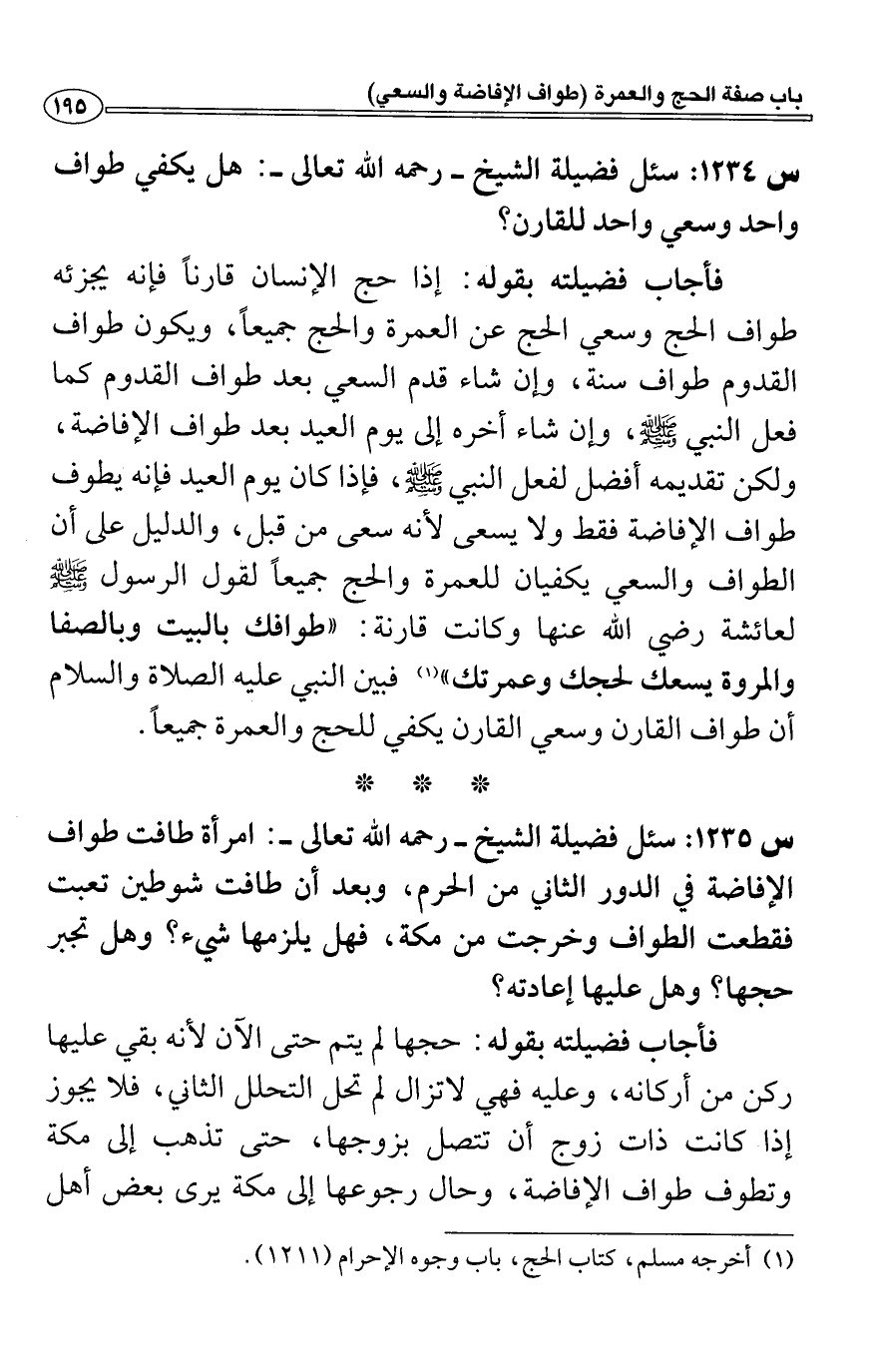 س1234: سئل فضيلة الشيخ- رحمه الله تعالى-: هل يكفي طواف واحد وسعي واحد للقارن؟