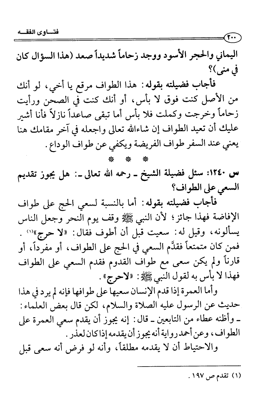 س1240: سئل فضيلة الشيخ- رحمه الله تعالى-: هل يجوز تقديم السعي على الطواف؟