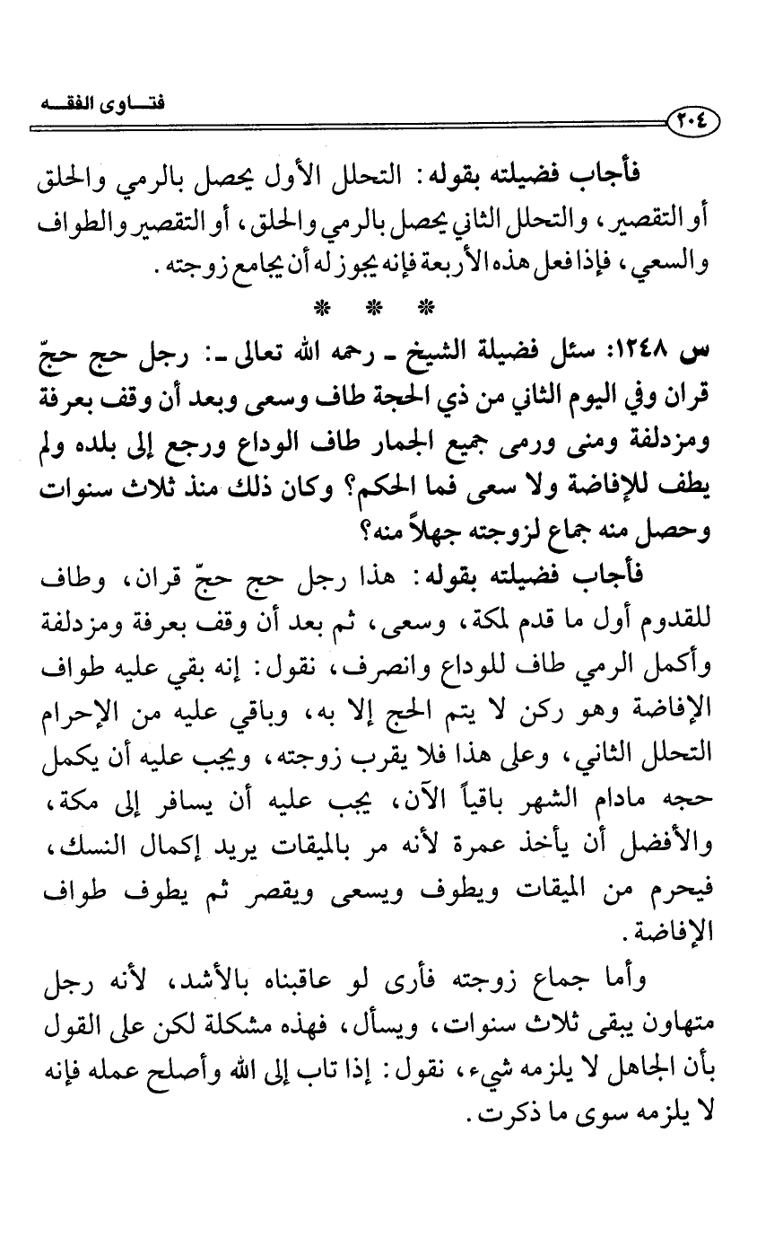 س1248: سئل فضيلة الشيخ- رحمه الله تعالى-: رجل حج حجّ قران وفي اليوم الثاني من ذي الحجة طاف وسعى وبعد أن وقف بعرفة ومزدلفة ومنى ورمى جميع الجمار طاف الوداع ورجع إلى بلده ولم يطف للإفاضة ولا سعى فما الحكم؟ وكان ذلك منذ ثلاث سنوات وحصل منه جماع لزوجته جهلاً منه؟