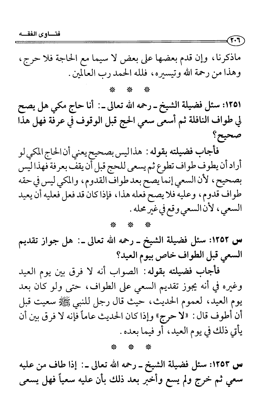 س1252: سئل فضيلة الشيخ- رحمه الله تعالى-: هل جواز تقديم السعي قبل الطواف خاص بيوم العيد؟