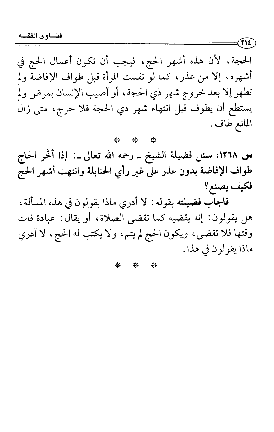 س1268: سئل فضيلة الشيخ- رحمه الله تعالى-: إذا أخَّر الحاج طواف الإفاضة بدون عذر على غير رأي الحنابلة وانتهت أشهر الحج فكيف يصنع؟