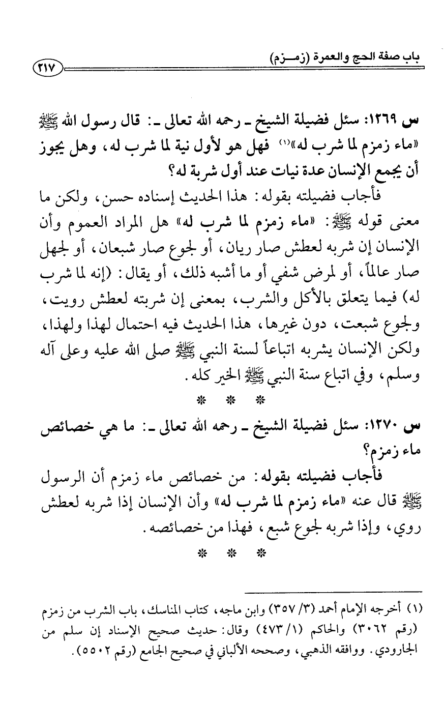 س1270: سئل فضيلة الشيخ- رحمه الله تعالى-: ما هي خصائص ماء زمزم؟
