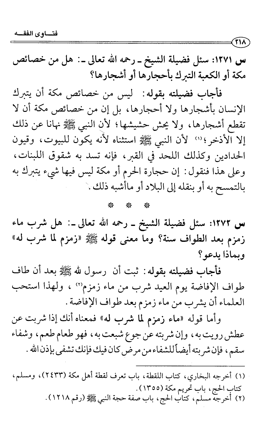 فأجاب فضيلته بقوله: ليس من خصائص مكة أن يتبرك الإنسان بأشجارها ولا أحجارها، بل إن من خصائص مكة أن لا تقطع أشجارها، ولا يحش حشيشها؛ لأن النبي - صلى الله عليه وسلم - نهانا عن ذلك إلا الأذخر؟ (1) لأن النبي - صلى الله عليه وسلم - استثناه لأنه يكون للبيوت، وقيون