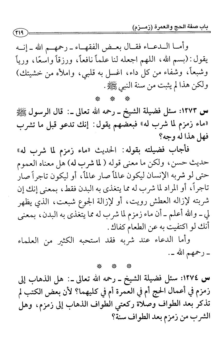 س1274: سئل فضيلة الشيخ- رحمه الله تعالى-: هل الذهاب إلى زمزم في أعمال الحج أم في العمرة أم في كليهما؛ لأن بعض الكتب لم تذكر بعد الطواف وصلاة ركعتي الطواف الذهاب إلى زمزم، وهل الشرب من زمزم بعد الطواف سنة؟