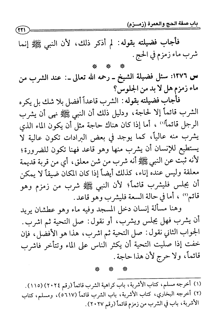 س1276: سئل فضيلة الشيخ- رحمه الله تعالى-: عند الشرب من ماء زمزم هل لابد من الجلوس؟