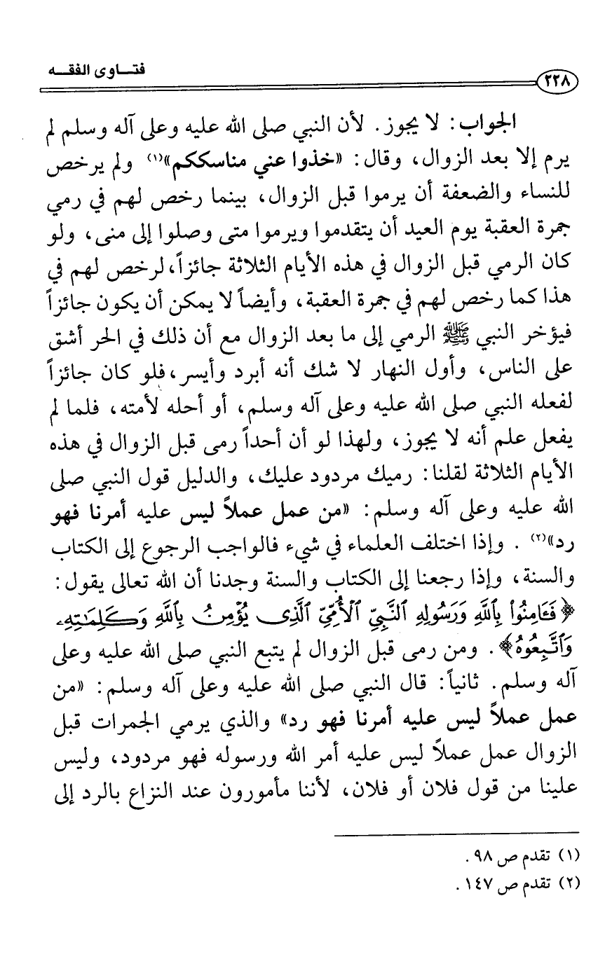 الأيام الثلاثة لقلنا: رميك مردود عليك، والدليل قول النبي صلى الله عليه وعلى آله وسلم: "من عمل عملاً ليس عليه أمرنا فهو رد" (2) . وإذا اختلف العلماء في شيء فالواجب الرجوع إلى الكتاب والسنة، وإذا رجعنا إلى الكتاب والسنة وجدنا أن الله تعالى يقول: (فَآَمِنُوا بِاللهِ وَرَسُولِهِ النَّبِيِّ الأُمِّيِّ الَّذِي يُؤْمِنُ بِاللهِ وَكَلِمَاتِهِ وَاتَّبِعُوهُ) ومن رمى قبل الزوال لم يتبع النبي صلى الله عليه وعلى اَله وسلم. ثانياً: قال النبي صلى الله عليه وعلى اَله وسلم: "من عمل عملاً ليس عليه أمرنا فهو رد" والذي يرمي الجمرات قبل الزوال عمل عملاً ليس عليه أمر الله ورسوله فهو مردود، وليس علينا من قول فلان أو فلان، لأننا مأمورون عند النزاع بالرد إلى