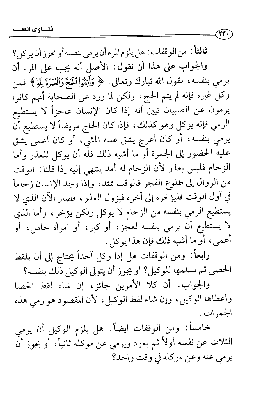 خامساً: ومن الوقفات أيضاً: هل يلزم الوكيل أن يرمي الثلاث عن نفسه أولاً ثم يعود ويرمي عن موكله ثانياً، أو يجوز أن يرمي عنه وعن موكله في وقت واحد؟