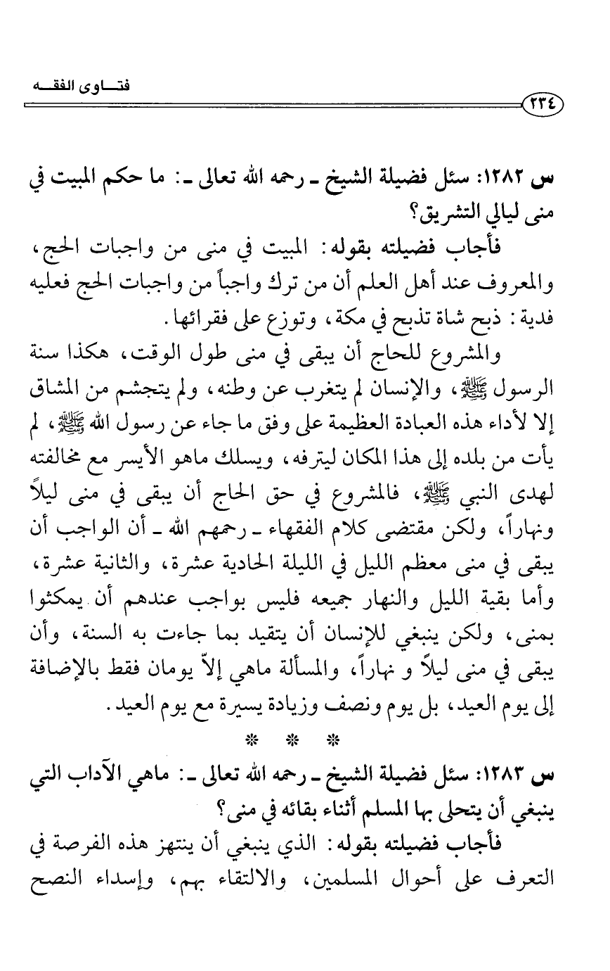 س1283: سئل فضيلة الشيخ- رحمه الله تعالى-: ما هي الآَداب التي ينبغي أن يتحلى بها المسلم أثناء بقائه في منى؟