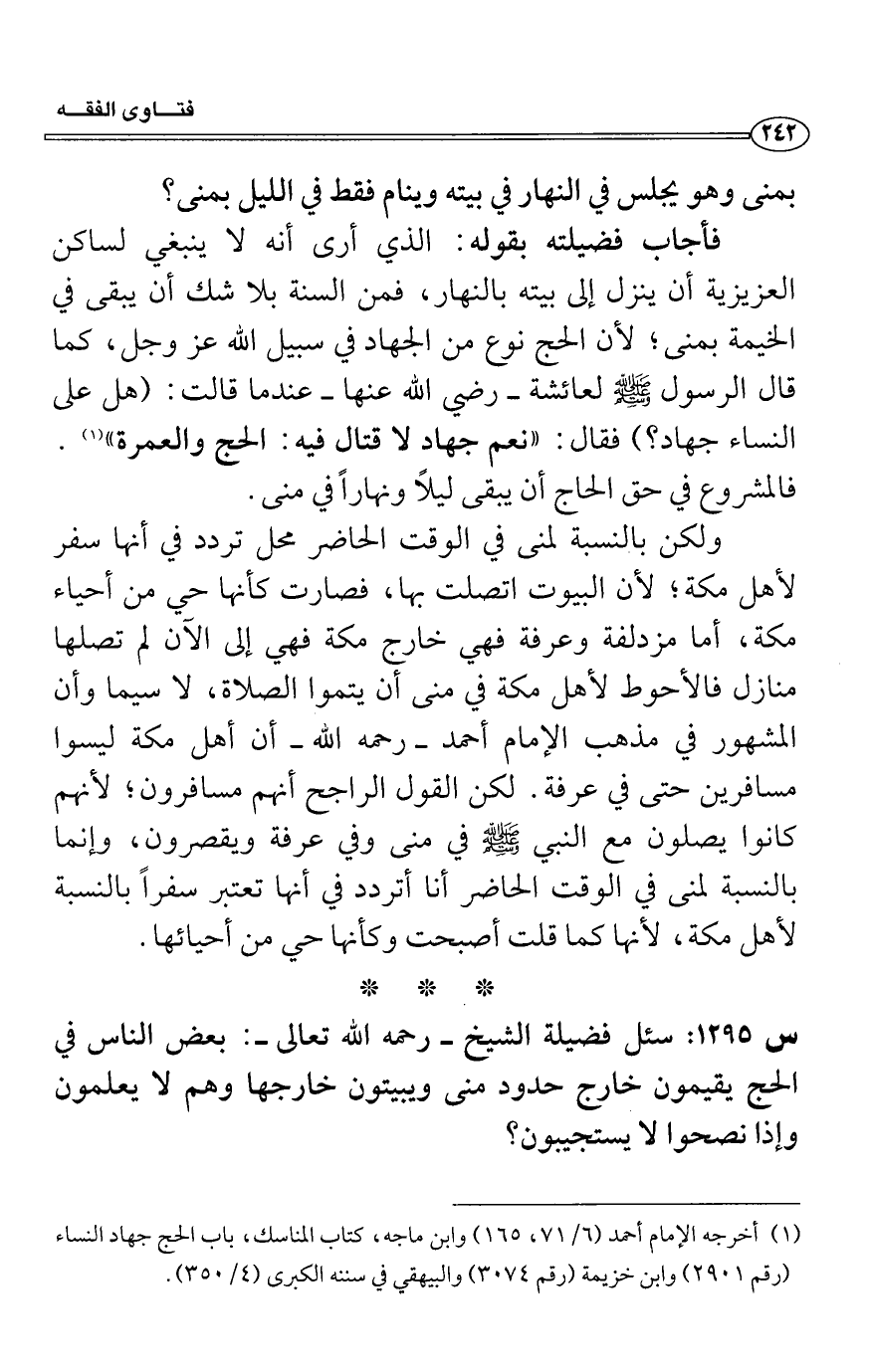 فأجاب فضيلته بقوله: الذي أرى أنه لا ينبغي لساكن العزيزية أن ينزل إلى بيته بالنهار، فمن السنة بلا شك أن يبقى في الخيمة بمنى؛ لأن الحج نوع من الجهاد في سبيل الله عز وجل، كما قال الرسول - صلى الله عليه وسلم - لعائشة- رضي الله عنها- عندما قالت: (هل على النساء جهاد؟) فقال: "نعم جهاد لا قتال فيه: الحج والعمرة" (1) .