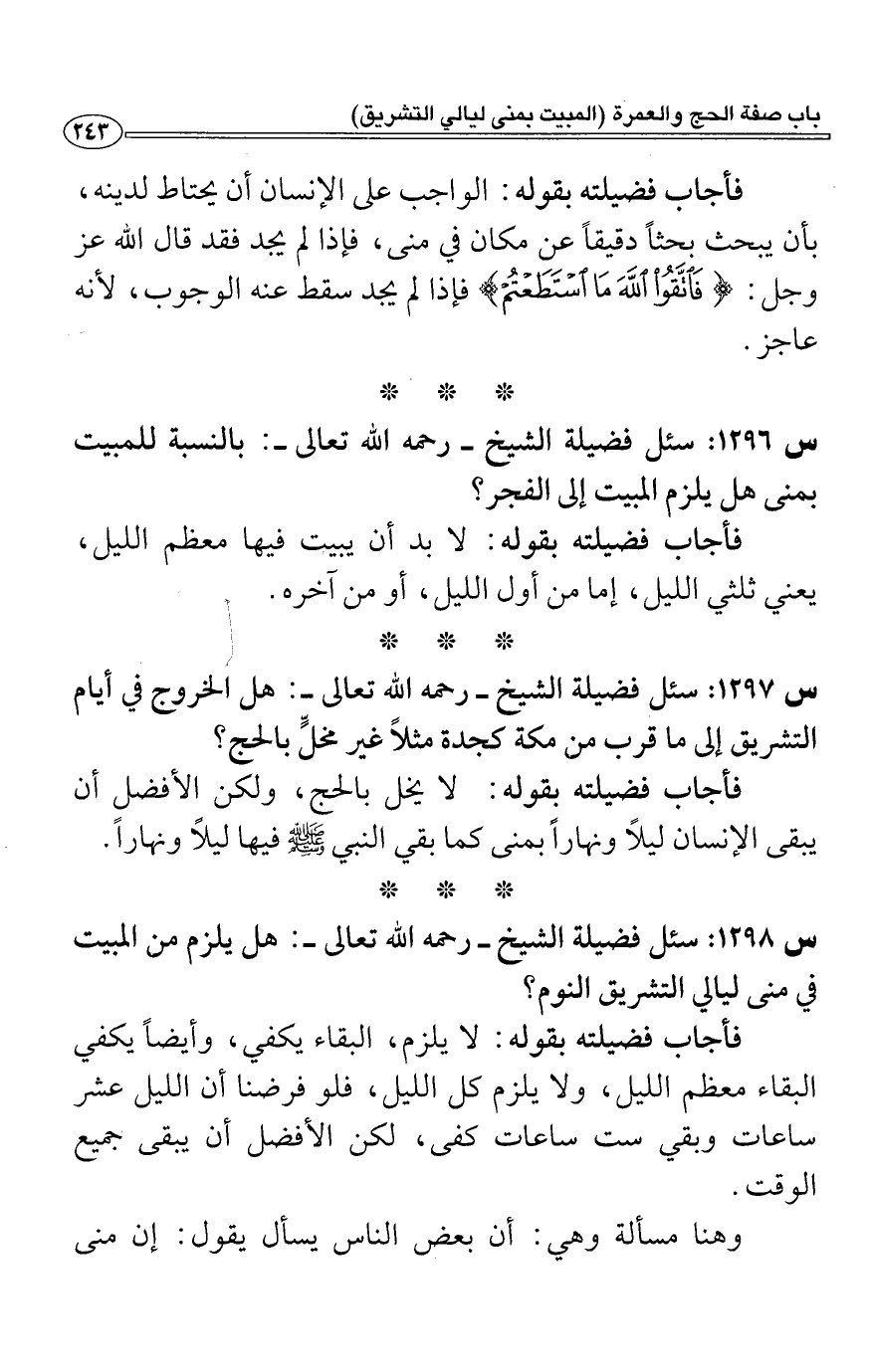 س1296: سئل فضيلة الشيخ- رحمه الله تعالى-: بالنسبة للمبيت بمنى هل يلزم المبيت إلى الفجر؟