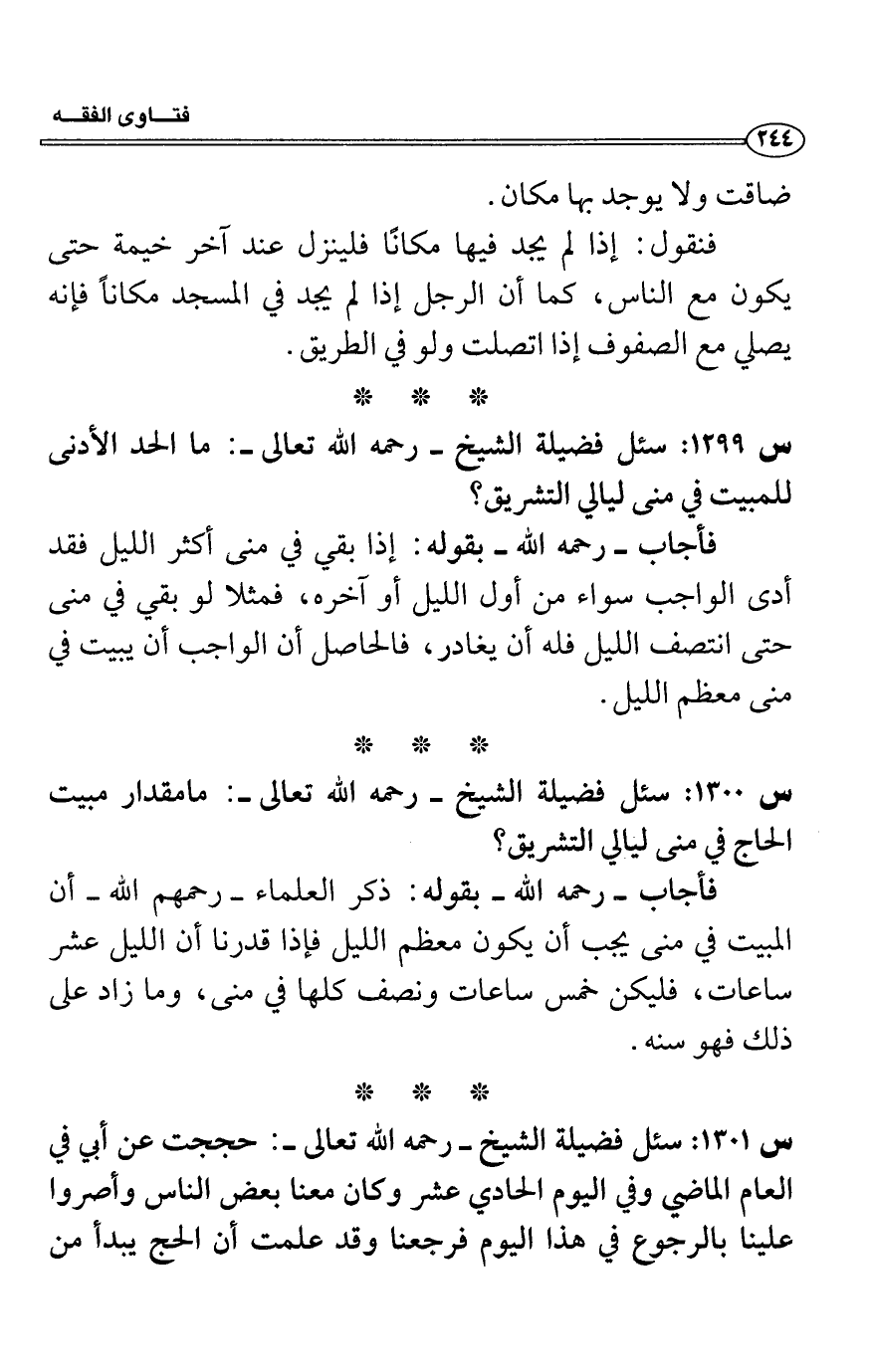 س1299: سئل فضيلة الشيخ- رحمه الله تعالى-: ما الحد الأدنى للمبيت في منى ليالي التشريق؟