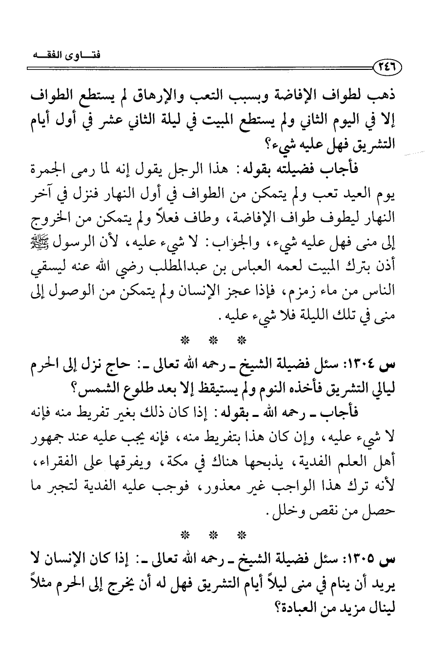 فأجاب فضيلته بقوله: هذا الرجل يقول إنه لما رمى الجمرة يوم العيد تعب ولم يتمكن من الطواف في أول النهار فنزل في آخر النهار ليطوف طواف الإفاضة، وطاف فعلاً ولم يتمكن من الخروج إلى منى فهل عليه شيء، والجواب: لا شيء عليه، لأن الرسول - صلى الله عليه وسلم - أذن بترك المبيت لعمه العباس بن عبد الطلب رضي الله عنه ليسقي الناس من ماء زمزم، فإذا عجز الإنسان ولم يتمكن من الوصول إلى منى في تلك الليلة فلا شيء عليه.
