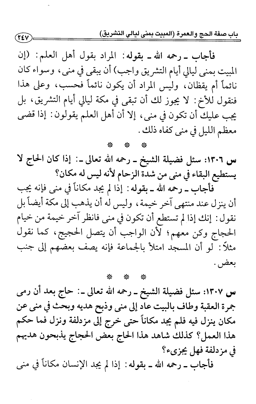 فأجاب- رحمه الله- بقوله: الراد بقول أهل العلم: (إن البيت بمنى ليالي أيام التشريق واجب) أن يبقى في منى، وسواء كان نائماً أم يقظان، وليس الراد أن يكون نائماً فحسب، وعلى هذا فنقول للأخ: لا يجوز لك أن تبقى في مكة ليالي أيام التشريق، بل يجب عليك أن تكون في منى، إلا أن أهل العلم يقولون: إذا قضى معظم الليل في منى كفاه ذلك.
