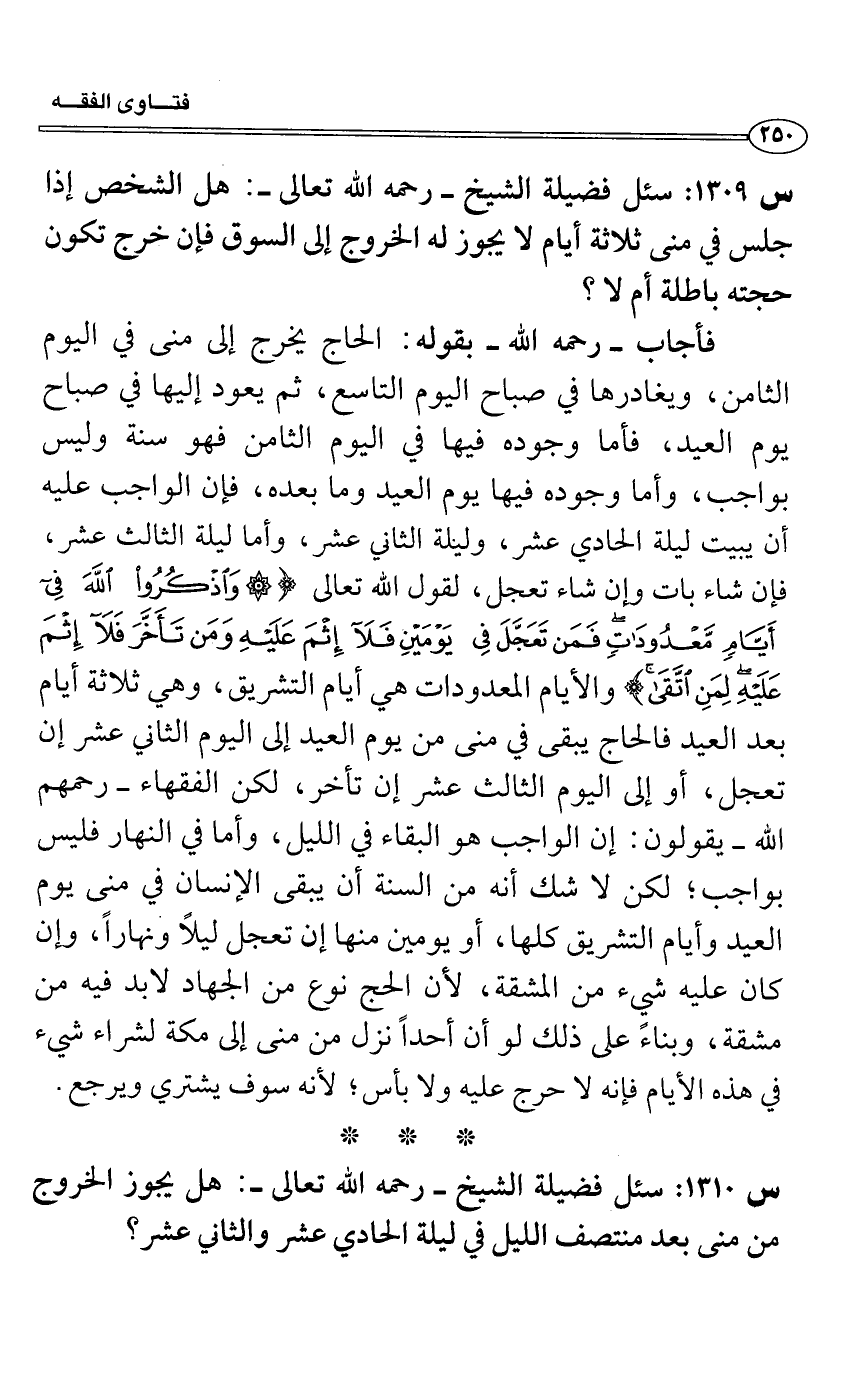 فأجاب- رحمه الله- بقوله: الحاج يخرج إلى منى في اليوم الثامن، ويغادرها في صباح اليوم التاسع، ثم يعود إليها في صباح يوم العيد، فأما وجوده فيها في اليوم الثامن فهو سنة وليس بواجب، وأما وجوده فيها يوم العيد وما بعده، فإن الواجب عليه أن يبيت ليلة الحادي عشر، وليلة الثاني عشر، وأما ليلة الثالث عشر، فإن شاء بات وإن شاء تعجل، لقول الله تعالى (وَاذْكُرُوا الله فِي أَيَّامٍ مَعْدُودَاتٍ فَمَنْ تَعَجَّلَ فِي يَوْمَيْنِ فَلَا إِثْمَ عَلَيْهِ وَمَنْ تَأَخَّرَ فَلَا إِثْمَ عَلَيْهِ لِمَنِ اتَّقَى وَاتَّقُوا الله وَاعْلَمُوا أَنَّكُمْ إِلَيْهِ تُحْشَرُونَ) والأيام المعدودات هي أيام التشريق، وهي ثلاثة أيام بعد العيد فالحاج يبقى في منى من يوم العيد إلى اليوم الثاني عشر إن تعجل، أو إلى اليوم الثالث عشر إن تأخر، لكن الفقهاء- رحمهم الله- يقولون: إن الواجب هو البقاء في الليل، وأما في النهار فليس بواجب؛ لكن لا شك أنه من السنة أن يبقى الإنسان في منى يوم العيد وأيام التشريق كلها، أو يومين منها إن تعجل ليلاً ونهاراً، وإن كان عليه شيء من المشقة، لأن الحج نوع من الجهاد لابد فيه من مشقة، وبناءً على ذلك لو أن أحداً نزل من منى إلى مكة لشراء شيء في هذه الأيام فإنه لا حرج عليهِ ولا بأس؛ لأنه سوف يشتري ويرجع.