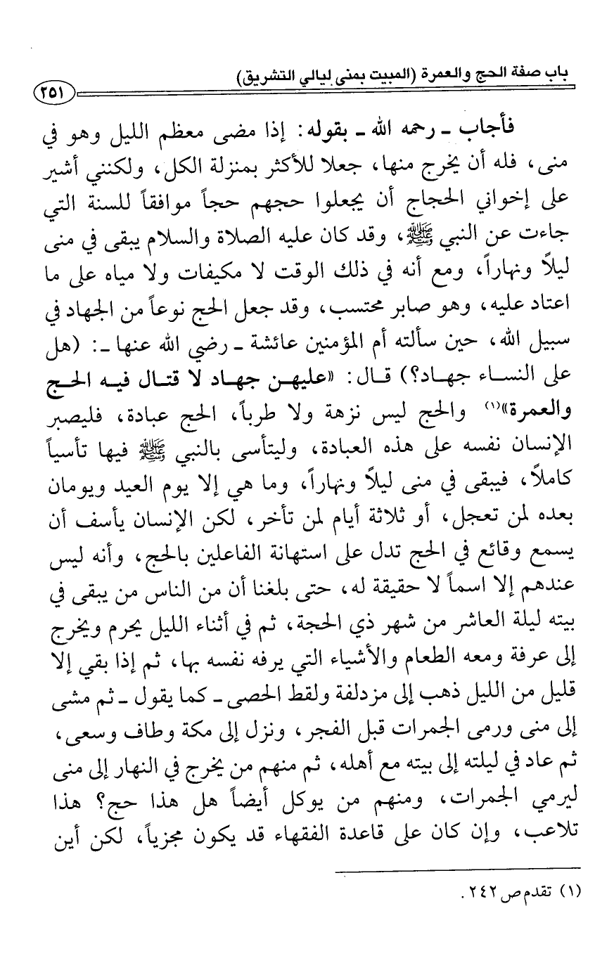 فأجاب- رحمه الله- بقوله: إذا مضى معظم الليل وهو في منى، فله أن يخرج منها، جعلا للأكثر بمنزلة الكل، ولكنني أشير على إخواني الحجاج أن يجعلوا حجهم حجاً موافقاً للسنة التي