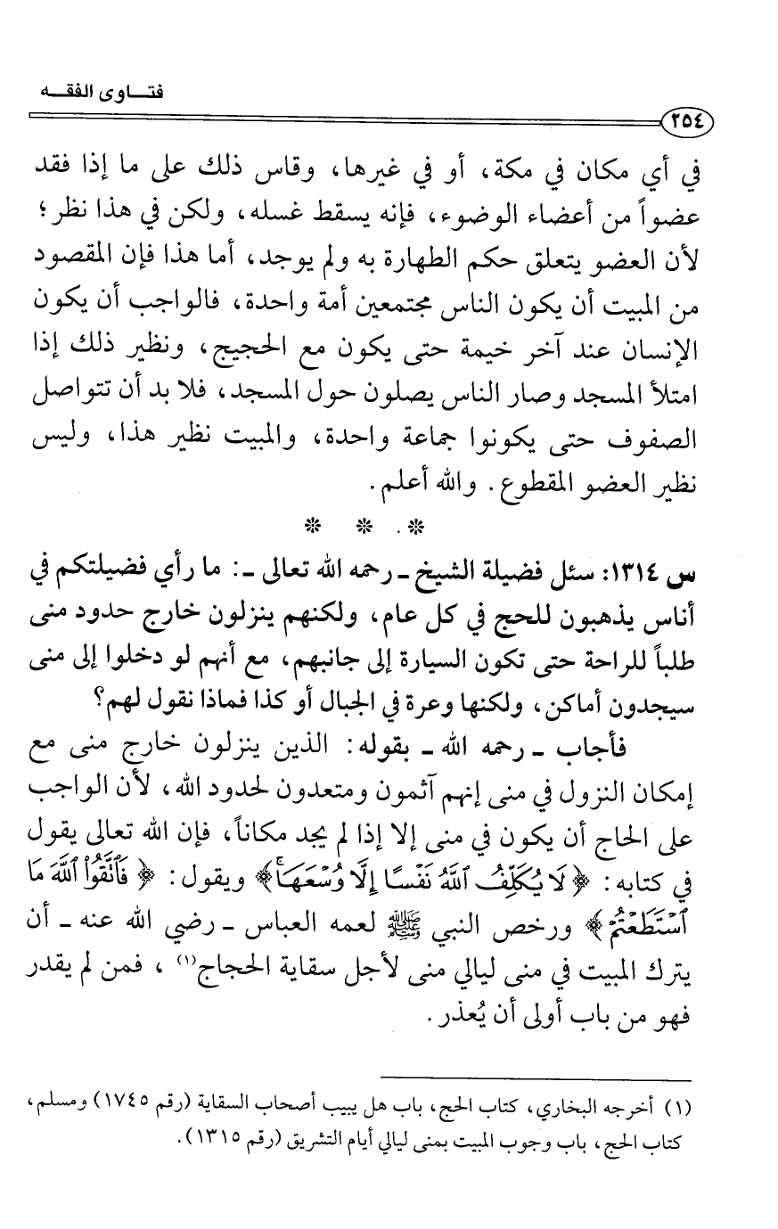 فأجاب- رحمه الله- بقوله: الذين ينزلون خارج منى مع إمكان النزول في منى إنهم آثمون ومتعدون لحدود الله، لأن الواجب على الحاج أن يكون في منى إلا إذا لم يجد مكاناً، فإن الله تعالى يقول في كتابه: (لاَ يُكَلِّفُ اللهُ نَفْسًا إِلاَّ وُسْعَهَا) ويقول: (اتَّقُوا اللهَ مَا اسْتَطَعْتُمْ) ورخص النبي - صلى الله عليه وسلم - لعمه العباس- رضي الله عنه- أن يترك البيت في منى ليالي منى لأجل سقاية الحجاج (1) ، فمن لم يقدر فهو من باب أولى أن يُعذر.