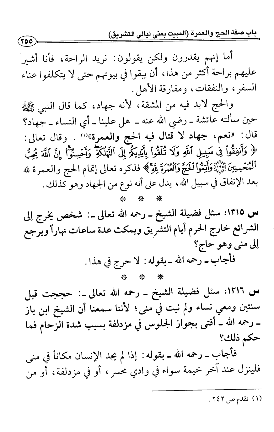والحج لابد فيه من المشقة، لأنه جهاد، كما قال النبي - صلى الله عليه وسلم - حين سألته عائشة- رضي الله عنه- هل علينا- أي النساء- جهاد؟ قال: "نعم، جهاد لا قتال فيه الحج والعمرة" (1) . وقال تعالى: (وَأَنْفِقُوا فِي سَبِيلِ الله وَلَا تُلْقُوا بِأَيْدِيكُمْ إِلَى التَّهْلُكَةِ وَأَحْسِنُوا إِنَّ الله يُحِبُّ الْمُحْسِنِينَ (195) وَأَتِمُّوا الْحَجَّ وَالْعُمْرَةَ لله) فذكره تعالى إتمام الحج والعمرة لله بعد الإنفاق في سبيل الله، يدلِ على أنِه نوع من الجهاد وهو كذلك.