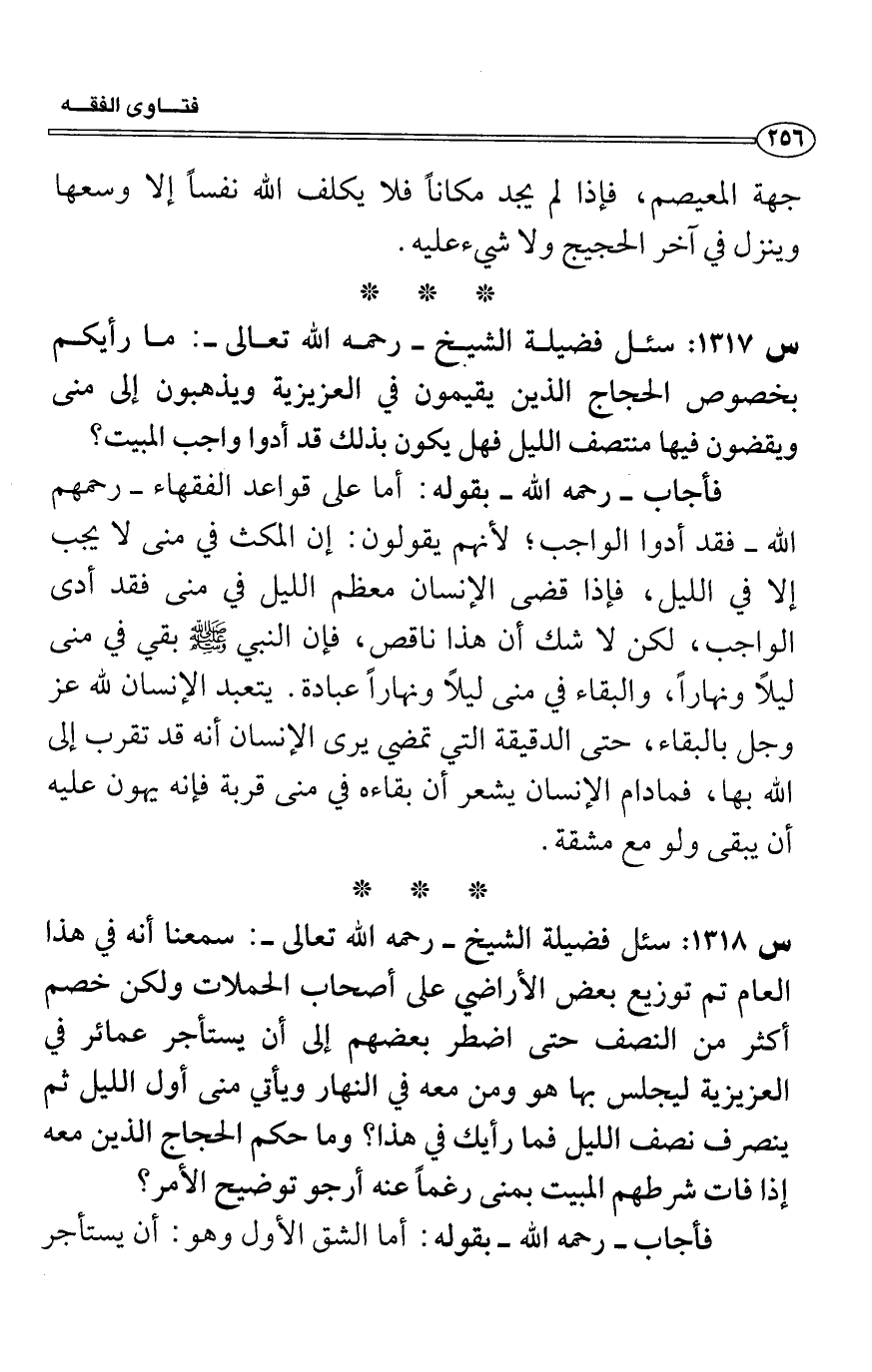 س1317: سئل فضيلة الشيخ رحمَه الله تعالى-: ما رأيكم بخصوص الحجاج الذين يقيمون في العزيزية ويذهبون إلى منى ويقضون فيها منتصف الليل فهل يكون بذلك قد أدوا واجب البيت؟