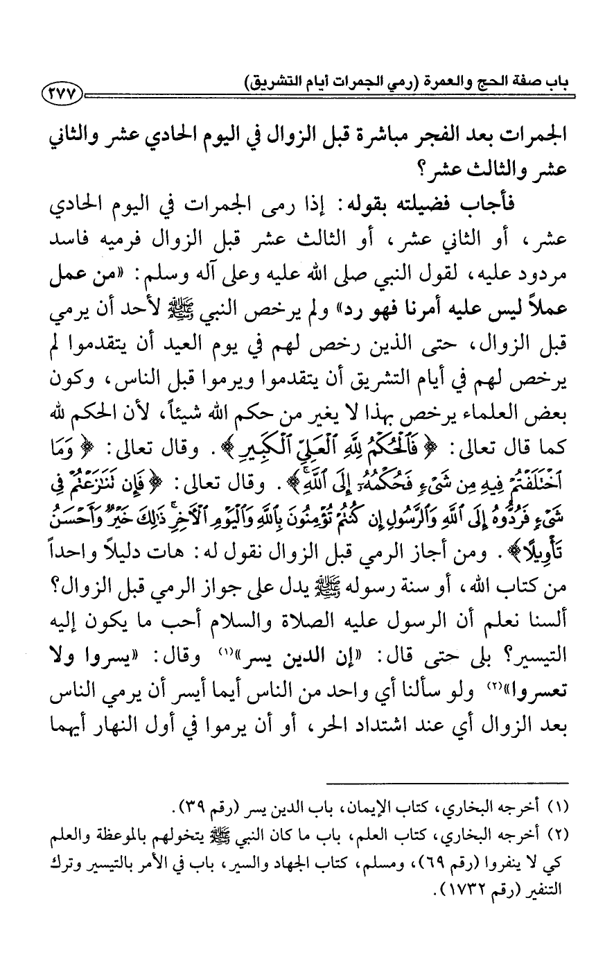 فأجاب فضيلته بقوله: إذا رمى الجمرات في اليوم الحادي عشر، أو الثاني عشر، أو الثالث عشر قبل الزوال فرميه فاسد مردود عليه، لقول النبي صلى الله عليه وعلى آله وسلم: "من عمل عملاً ليس عليه أمرنا فهو رد" ولم يرخص النبي - صلى الله عليه وسلم - لأحد أن يرمي قبل الزوال، حتى الذين رخص لهم في يوم العيد أن يتقدموا لم يرخص لهم في أيام التشريق أن يتقدموا ويرموا قبل الناس، وكون بعض العلماء يرخص بهذا لا يغير من حكم الله شيئاً، لأن الحكم لله كما قال تعالى: (فَالْحُكْمُ لله الْعَلِيِّ الْكَبِيرِ) وقال تعالى: (وَمَا اخْتَلَفْتُمْ فِيهِ مِنْ شَيْءٍ فَحُكْمُهُ إِلَى الله) وقال تعالى: (فَإِنْ تَنَازَعْتُمْ فِي شَيْءٍ فَرُدُّوهُ إِلَى الله وَالرَّسُولِ إِنْ كُنْتُمْ تُؤْمِنُونَ بِاللَّهِ وَالْيَوْمِ الْآَخِرِ ذَلِكَ خَيْرٌ وَأَحْسَنُ تَأْوِيلًا) ومن أجاز الرمي قبل الزوال نقول له: هات دليلاً واحداً من كتاب الله، أو سنة رسوله - صلى الله عليه وسلم - يدل على جواز الرمي قبل الزوال؟ ألسنا نعلم أن الرسول عليه الصلاة والسلام أحب ما يكون إليه التيسير؟ بلى حتى قال: "إن الدين يسر" (1) وقال: "يسروا ولا